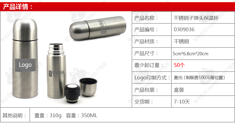 不锈钢子弹头保温杯 50个起定制logo员工福利商务赠送实用礼品